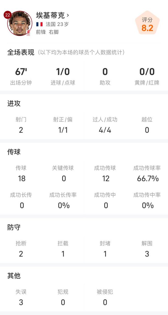 雷速体育9月20日讯 英超第5轮,利物浦主场2比1暂时领先埃弗顿。利物浦前锋埃基蒂克首发出战67分钟,为球队打入第二球。