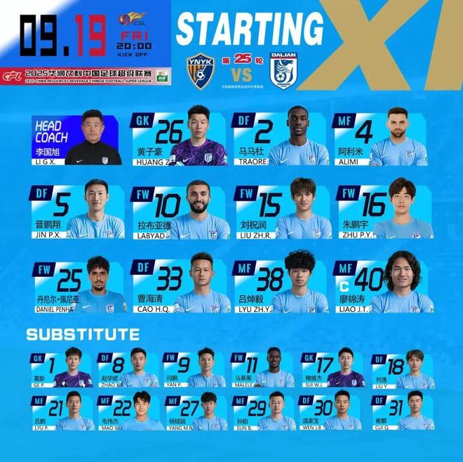 此役,大连英博海发由黄子豪担任首发门将,曹海清、晋鹏翔、马马杜、吕焯毅、刘祝润、廖锦涛、朱鹏宇、拉布亚德、阿利米、佩尼亚首发出战,有伤在身的马莱莱则在替补席待命。云南玉昆则是五外援齐发,大连籍门将马镇首发坐镇门前。