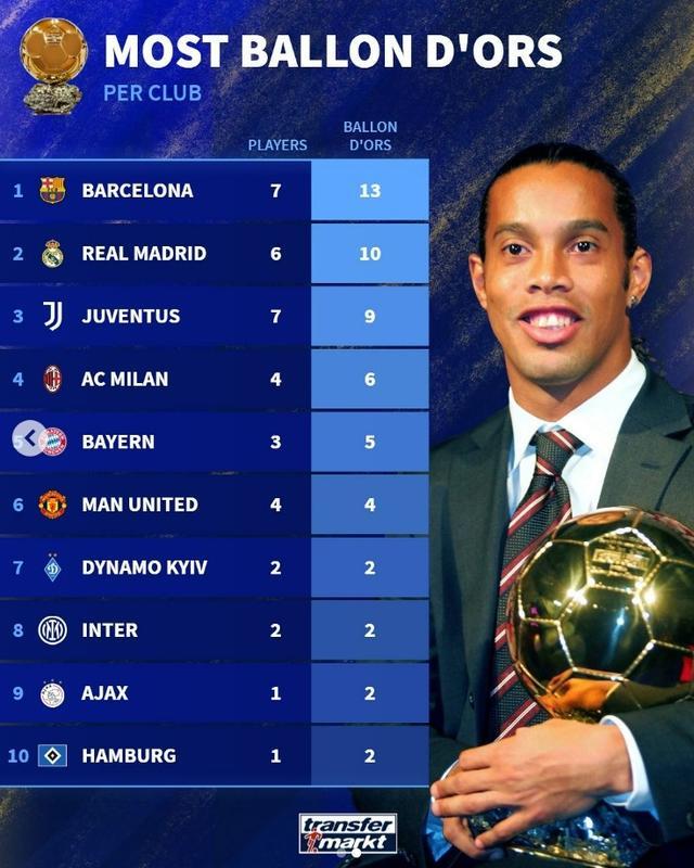 9月22日讯 金球奖颁奖典礼开幕在即,德转也盘点了在此前获得金球奖次数最多的俱乐部榜单,其中巴萨球员13次居首,具体如下: