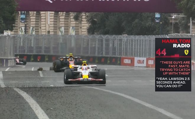 虽然借助劳森的成功防守,汉密尔顿也来到了诺里斯身后的DRS区,但在他身前的三位车手速度都不慢,老汉此后也通过TR和车队表示,前车挺快的但自己也会尽力。车队也给予鼓励,他和劳森的差距在2.5秒,相信汉密尔顿可以做到!