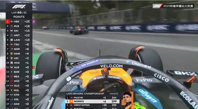 北京时间9月21日晚,2025赛季F1结束了阿塞拜疆站的争夺。最终,维斯塔潘无懈可击实现Pole To Win!拉塞尔获得亚军,塞恩斯获得第三,赛季首次登上领奖台!皮亚斯特里首圈上墙退赛,但诺里斯没能抓住机会,换胎工4.1秒的失误让其最终仅位列第七。