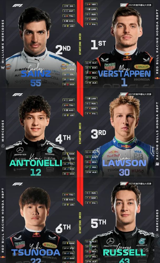 安东内利获得第四,第五至第十名分别是劳森、角田、诺里斯、汉密尔顿、勒克莱尔和哈贾尔。这一站,小红牛的表现十分坚韧,双车得分的同时频频贡献精彩防守!