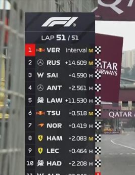 拉塞尔收获第二,塞恩斯本场比赛表现稳健获得季军,本赛季首次代表威廉姆斯登上领奖台。安东内利获得第四,第五至第十名分别是劳森、角田、诺里斯、汉密尔顿、勒克莱尔和哈贾尔。