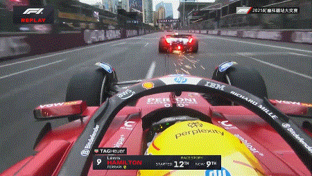 进入第8圈的1号弯前,汉密尔顿利用DRS的尾速获得身位优势,虽然哈贾尔毫不放弃,但依旧无法顶住身后汉密尔顿的攻势,被对手超越。