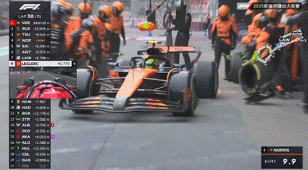 毫无疑问随着比赛的深入,勒克莱尔的优势将被蚕食殆尽,但第39圈麦克拉伦又一次“整活”!这一圈车队召唤诺里斯进站,然而右前胎的换胎工出现问题,换胎耗时达到4.1,直接被勒克莱尔超越。