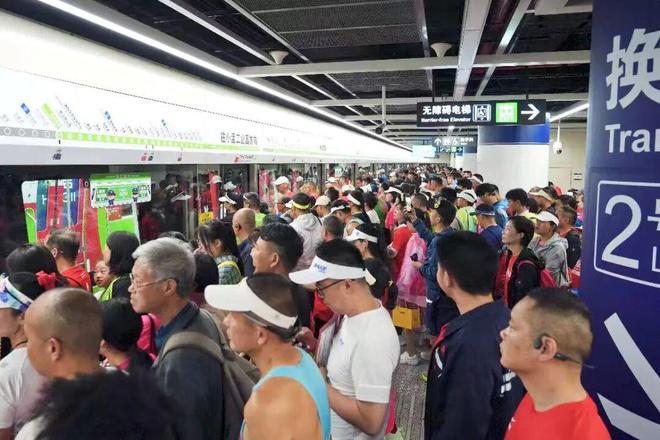 去起点的最早班地铁上,每一次到站,都有穿着背心短裤和各色跑鞋、戴着空顶帽背着参赛包的跑者上车,直到放眼望去,几乎满车厢都是“同类”,大家相视一笑中带着同样的紧张和期待。