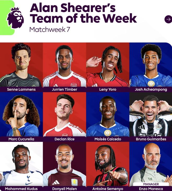 雷速体育10月6日讯 英超第7轮战罢,英超官方公布了阿兰·希勒评选的第7轮最佳阵容,切尔西有三名球员入选,曼联、阿森纳则各有两员。