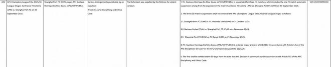 遭禁赛3场的古斯塔沃将缺席上港主场对阵町田泽维亚、客场挑战武里南联以及主场迎战首尔FC的比赛,此外他还被罚款2000美金。