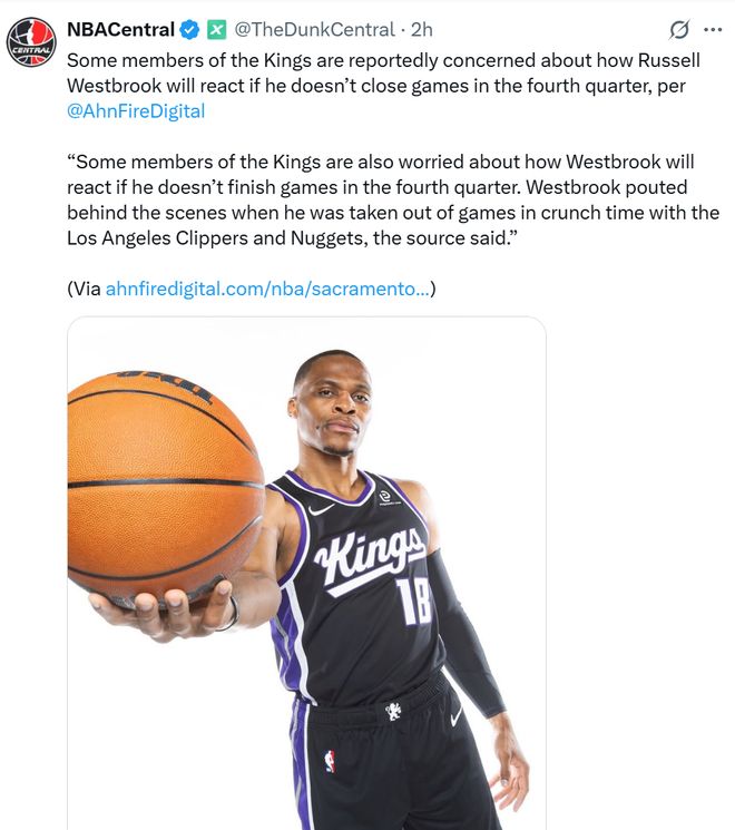 雷速体育10月21日讯 此前国王已经官宣了威少正式加盟球队的消息,这位历史三双王将开启自己的第18个赛季。知名账号NBACentral援引了记者AhnFireDigital的报道称,尽管小萨博尼斯、德罗赞和拉文等核心球员都表示很高兴能和威少一起打球,但一位联盟消息人士告诉AhnFireDigital,国王队内并非所有人都对威少的加盟感到兴奋。国王队的一些队员也担心威少如果在第四节无法完成比赛会作何反应。消息人士称,在上赛季对阵洛杉矶快船队和掘金队的关键时刻被换下场后,威少在场下撅着嘴很不高兴。此外,一位NBA高管在谈到国王的这笔签约时并不看好,这位高管表示:“我觉得这会是一场灾难,德罗赞不会投三分,拉文不会防守任何人,威少的投篮能力也完全不行。”