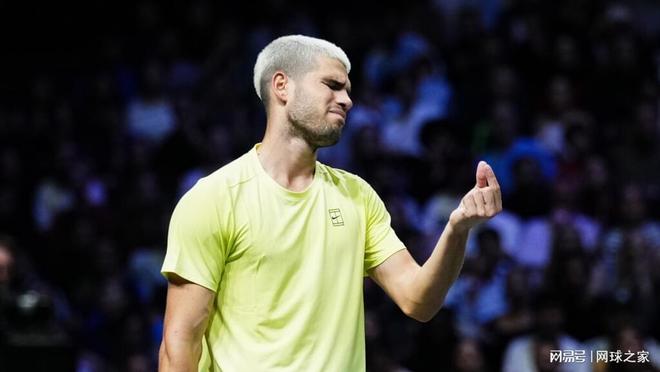 比赛中,阿尔卡拉斯一度对团队抱怨球场条件,称球场“像红土”,并表示自己完全“找不到球感”。他的挫败肉眼可见——直到决胜盘诺里的第三个发球局,他才拿到第一个接发分;而自己却几乎每局都要面临破发危机。