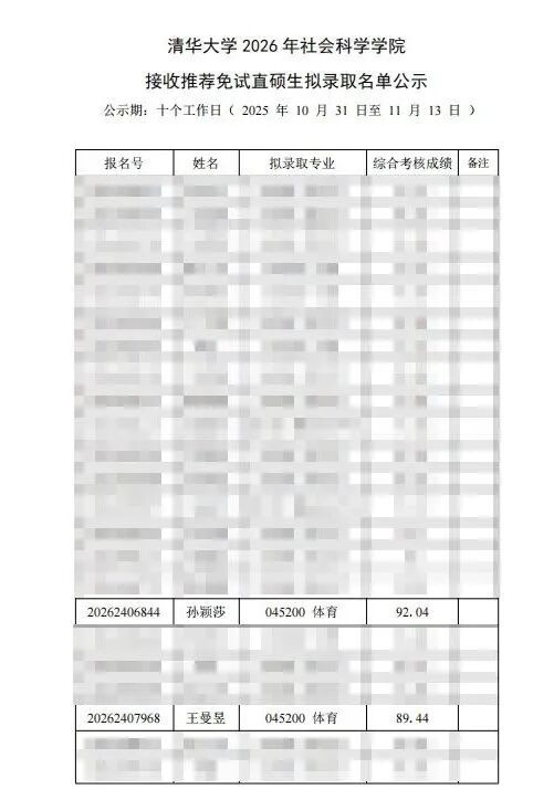 10月30日,清华大学2026年社会科学学院接收推荐免试直硕生拟录取名单公示,乒乓球运动员孙颖莎和王曼昱拟录取。