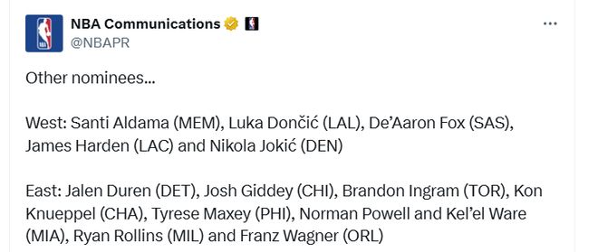 西部:阿尔达马(灰熊)、东契奇(湖人)、福克斯(马刺)、哈登(快船)、约基奇(掘金)东部:杜伦(活塞)、吉迪(公牛)、英格拉姆(猛龙)、克努佩尔(黄蜂)、马克西(76人)、鲍威尔和韦尔(热火)、罗林斯(雄鹿)、小瓦格纳(魔术)相关资讯