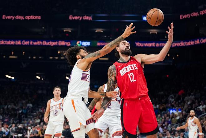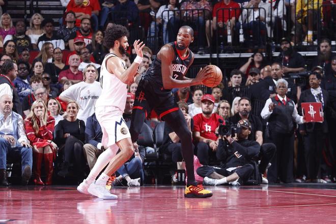 杜兰特。得篮板者得天下对于如今的火箭队而言,一口气将球放进篮筐并不轻松,但只要能把球送到篮筐附近,就已经成功了一半。根据“Cleaning the Glass”给出的数据,火箭队的半场进攻效率只排在第13位,但由于他们在进攻篮板上的出色表现,他们获得了更多的进攻机会。比如此前对阵丹佛掘金队的比赛,火箭队的真实投篮命中率比对手低了10个百分点(53.5%对63.7%),通常情况下,这样的数据意味着一场惨败,但火箭队仅以3分惜败。原因在于,那场比赛火箭队多抢了7个进攻篮板,以及多次通过争抢球权获得的额外进攻机会。篮板,成为了火箭队的生命线,即便他们并不擅长补篮得分,二次进攻的效率仅排在联盟第20位。但量变产生质变,本赛季火箭队每次投篮不中后,球队依然能收获0.328分——这一比例是联盟其他球队的两倍。太阳队主帅乔丹·奥特就曾这样形容火箭队:“他们的身高优势对我们来说是一个全新的挑战,火箭队外线球员的运动能力很强,以及他们首发的两名传统中锋身材高大,双方对于球权的争夺会非常激烈。”